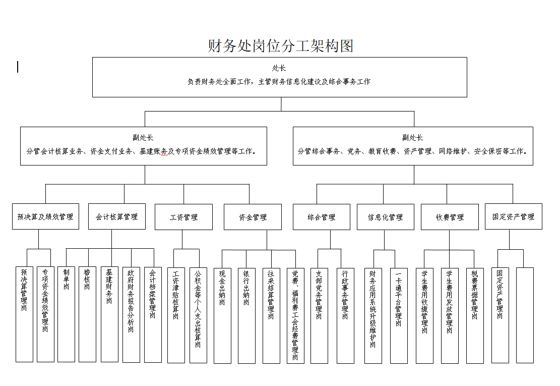 财务处是我校的一级财务机构,现有工作人员13名。全处人员在学校党委和行政的正确领导下,坚持依法理财,遵守 “ 不找任何借口 ” 的行为准则,积极培育 “ 责任、敬业、诚信、执行 ” 四大核心理念,全面提升职工的凝聚力,建设自己特有的财务管理文化,一个充满生机与活力的计财处将伴随着学校的改革和发展阔步向前。财务处进一步强化财务经营管理,切实履行职责,艰苦奋斗,团结奋进、开拓创新,在处领导班子的带领下,在一代又一代财会工作者的努力下,造就了一支政治素质高、业务能力强、团结务实、开拓创新、廉洁高效的财会队伍。近年来,财务处在院党委、行政的正确领导下,各项工作全面快步发展,制度建设与监控、单位经费预算改革、信息化建设、队伍建设呈现出鲜明特色,保证了学院教学、科研工作顺利进行,促进学院各项事业健康发展。